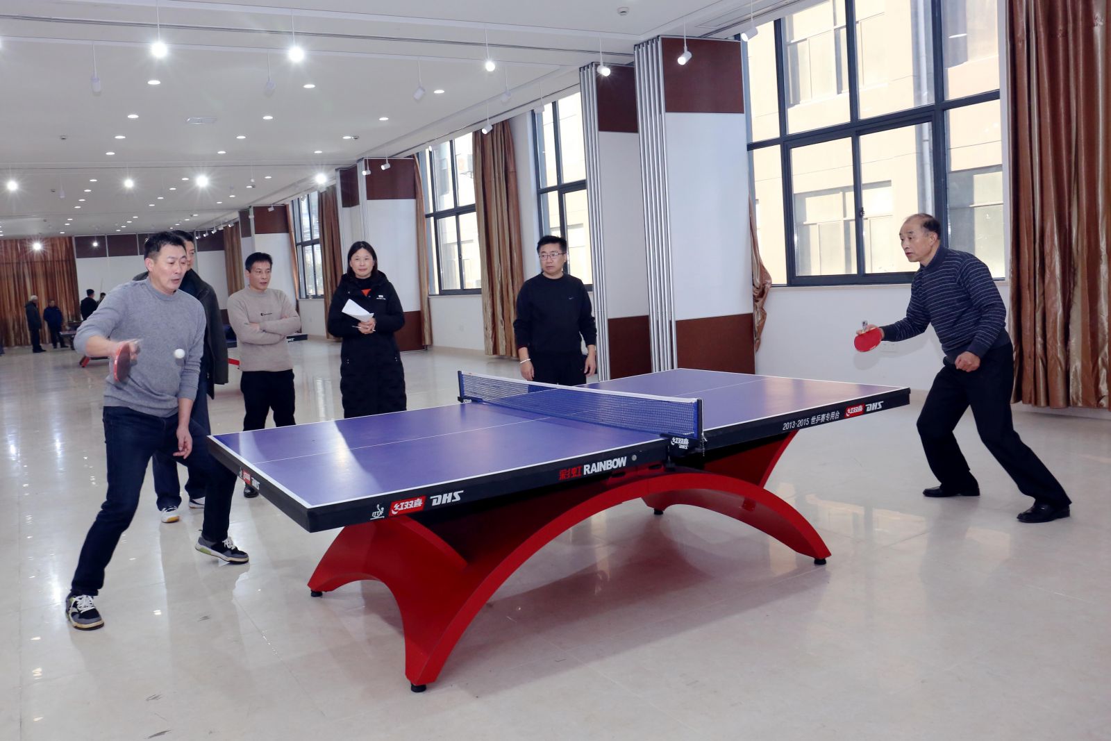 乒(pīng)乓乒乓,乒乒乓乓,參賽(sài)選(xuǎn)手誰都不甘示弱,使出了自己的看家本領。直拍(pāi)、橫拍、搓球(qiú)、弧線球、旋轉(zhuǎn)球、反手球,你來我當(dāng),好不熱鬧。不時傳(chuán)來的喝彩聲和鼓掌聲回蕩出優美奮進的旋律。