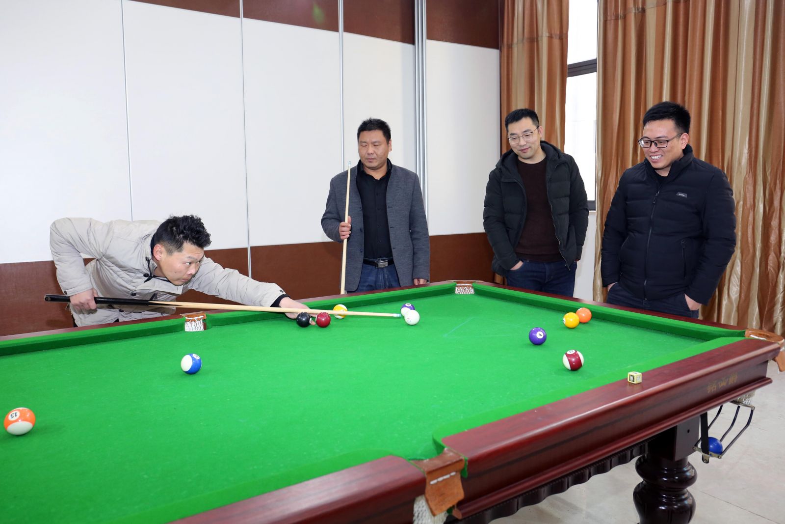 一樓展示廳(tīng)台球間充滿了台球比賽高昂的激情,比賽時選手們精神抖擻、積(jī)極(jí)應對,時而大力進攻,一杆定乾坤;時而輕碰防守,局勢撲朔迷離。都發揮出了自己的最高水平,使比賽高(gāo)潮迭起,充分展現了台球運動的魅力。