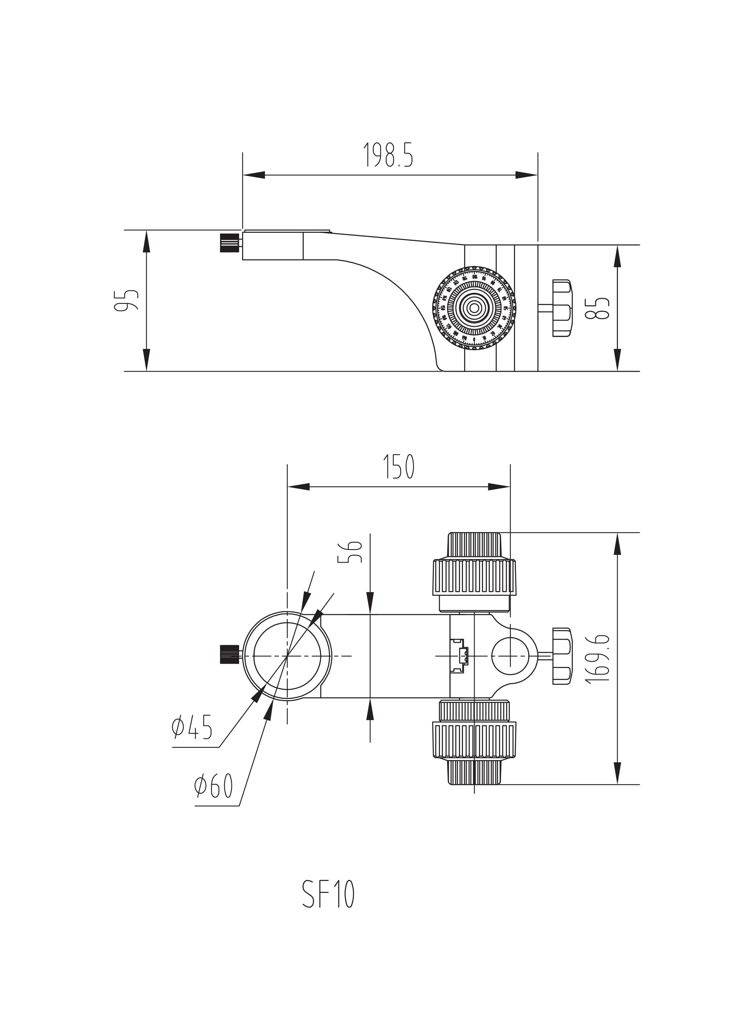 型號名稱:SF10升降組 說 明: ● 粗(cū)微調同軸手輪,可調整粗動調節手輪張力 ● 鏡體安裝孔直(zhí)徑Φ45mm ● 立柱安裝孔直徑Φ25mm ● 鏡體安(ān)裝孔與立柱(zhù)安裝孔中心距150mm